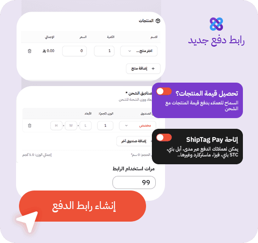 مع روابط الدفع، تقدر تنشئ رابط دفع لبوليصة شحن أو منتجات.. وترسله مباشرة للعميل أو تنشره على المواقع الإجتماعية، وعميلك يكمل الطلب والدفع، وأنت يوصلك طلب جاهز، والمبلغ المحصّل يدخل في محفظتك.